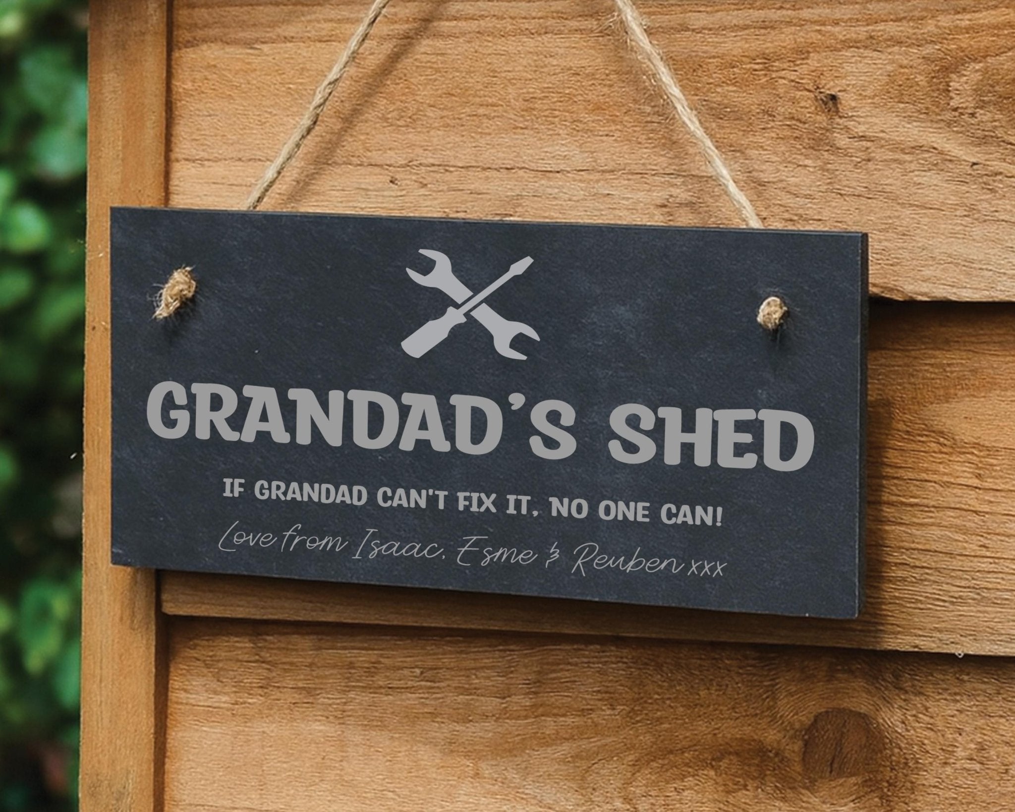 Give Grandad a gift he’ll truly treasure with this personalised slate shed sign, custom engraved with any message you choose. Whether it’s “Grandad’s Shed,” “Grandad’s Workshop,” “Dad’s Tools – Keep Out,” or a heartfelt personal note, this sign adds charm, personality and pride to his favourite space.