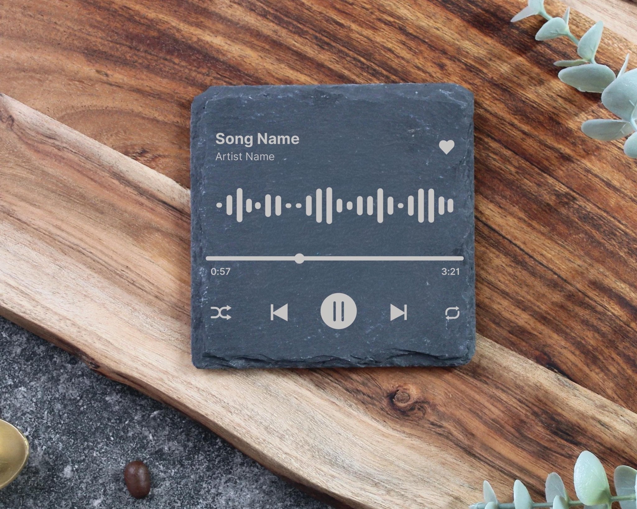 Choose any song, whether it's your "First Dance," a road trip anthem, or a best friend's favourite track—and we will engrave its unique scannable sound wave code directly onto the slate. Simply open the Spotify app on your phone, scan the coaster, and the song will instantly start playing.