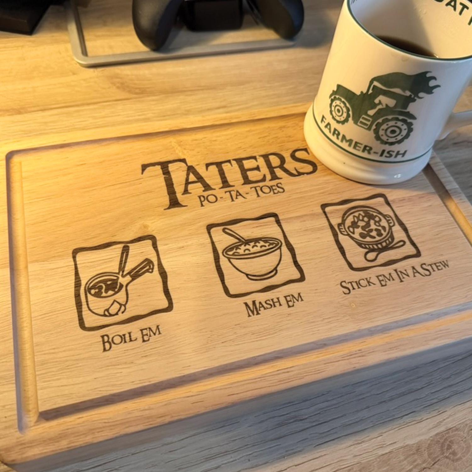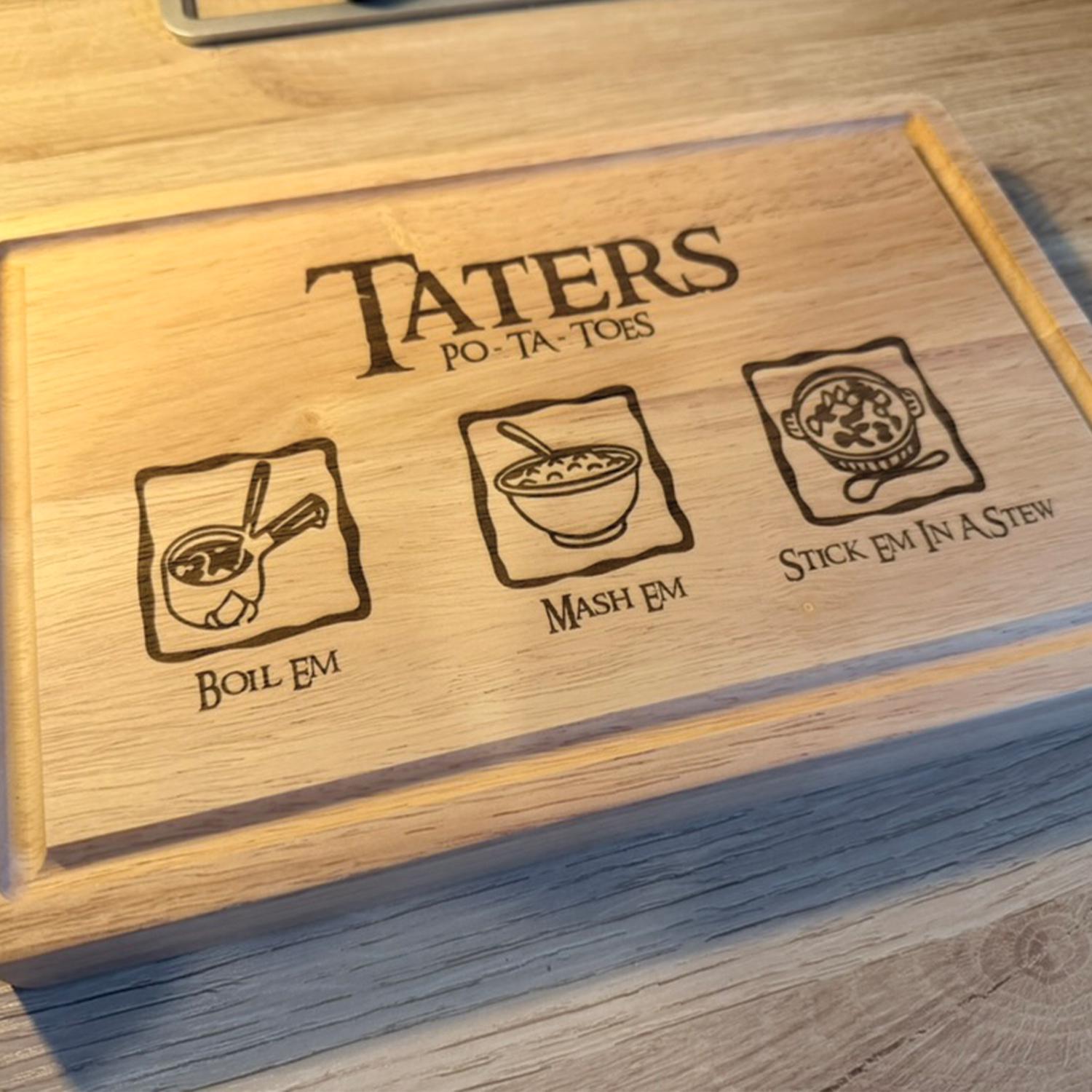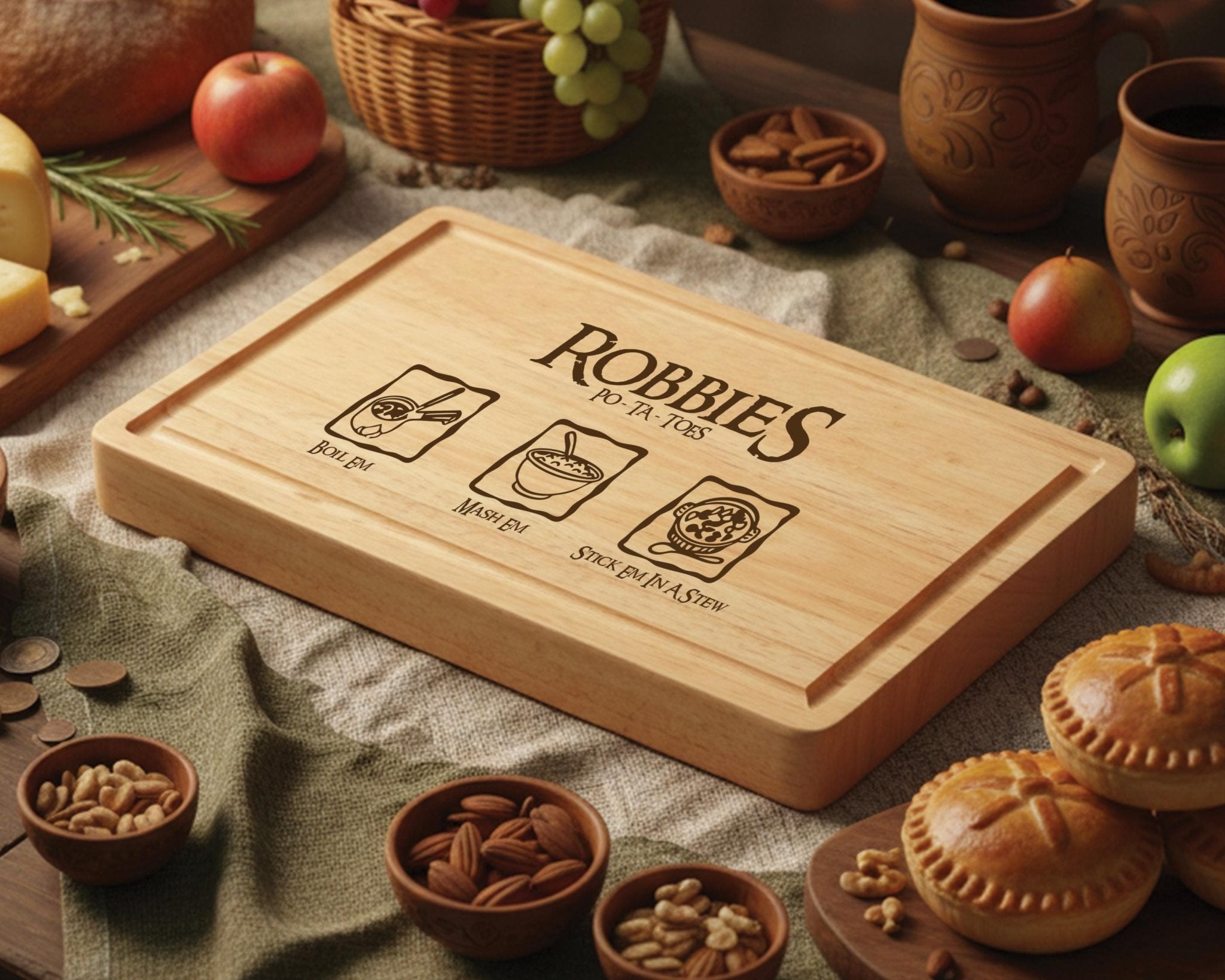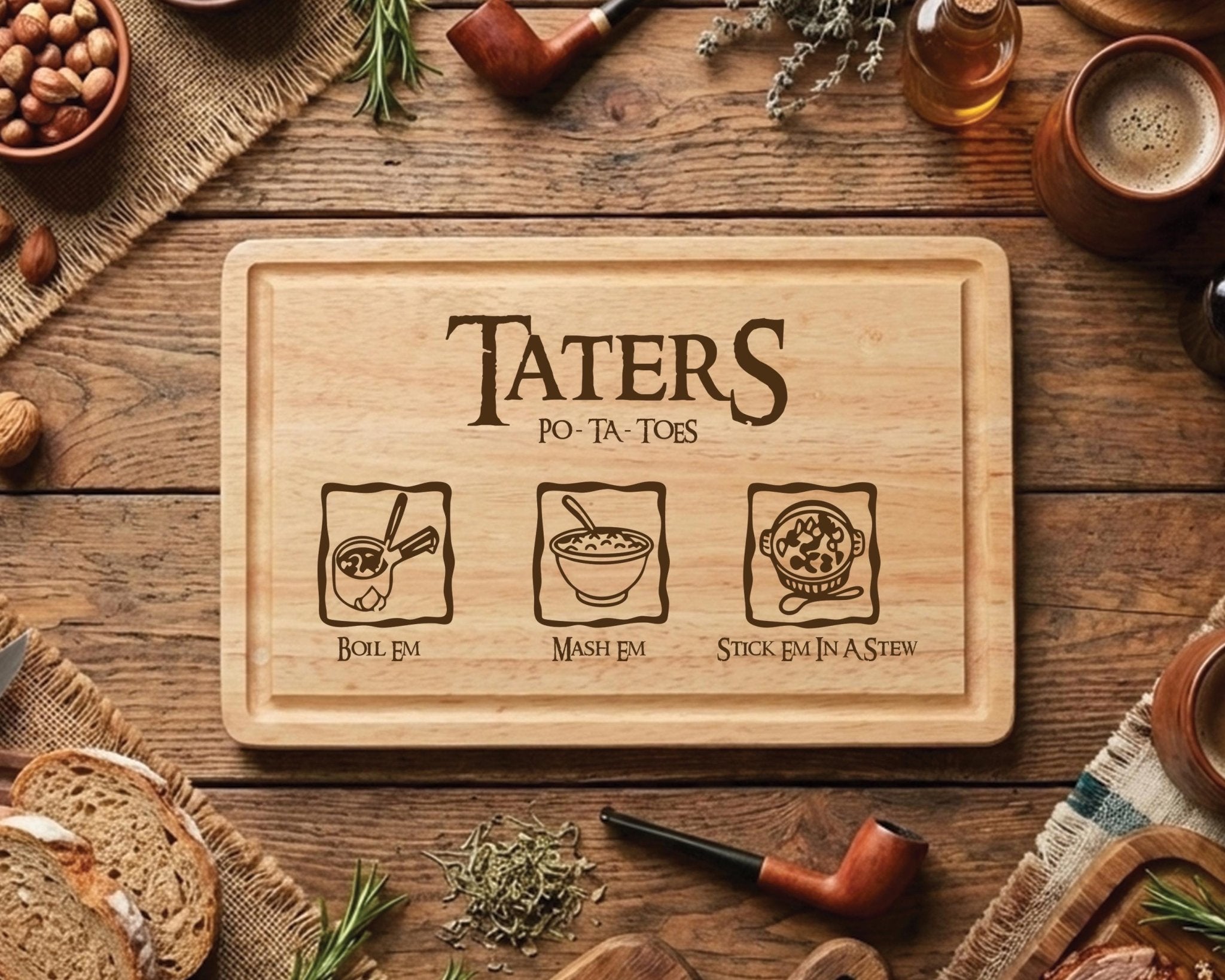 Expertly engraved with the iconic "Po-ta-toes" quote, this board serves as both a hilarious piece of kitchen decor and a functional cooking tool. It is the ultimate housewarming gift for couples, a thoughtful present for chefs, or a treat for your own home.