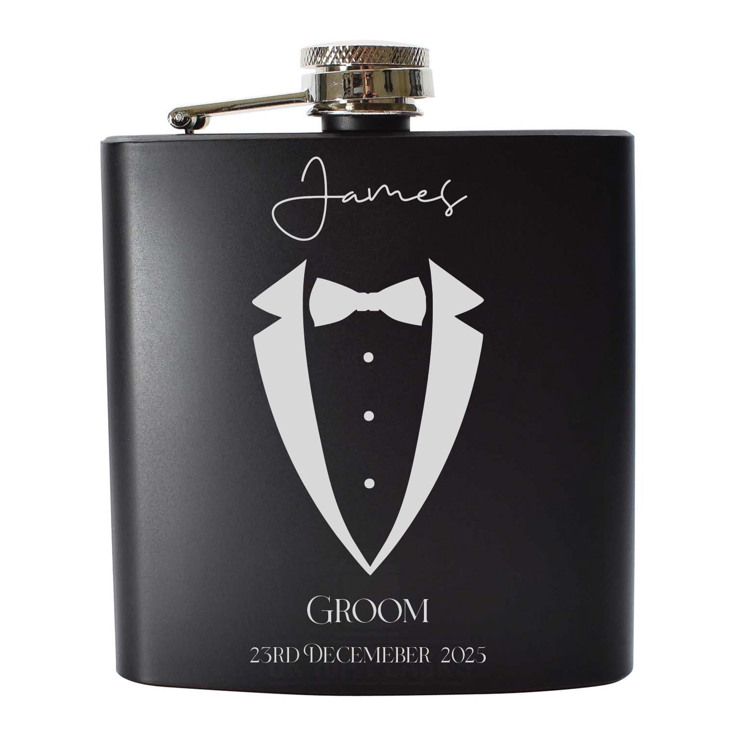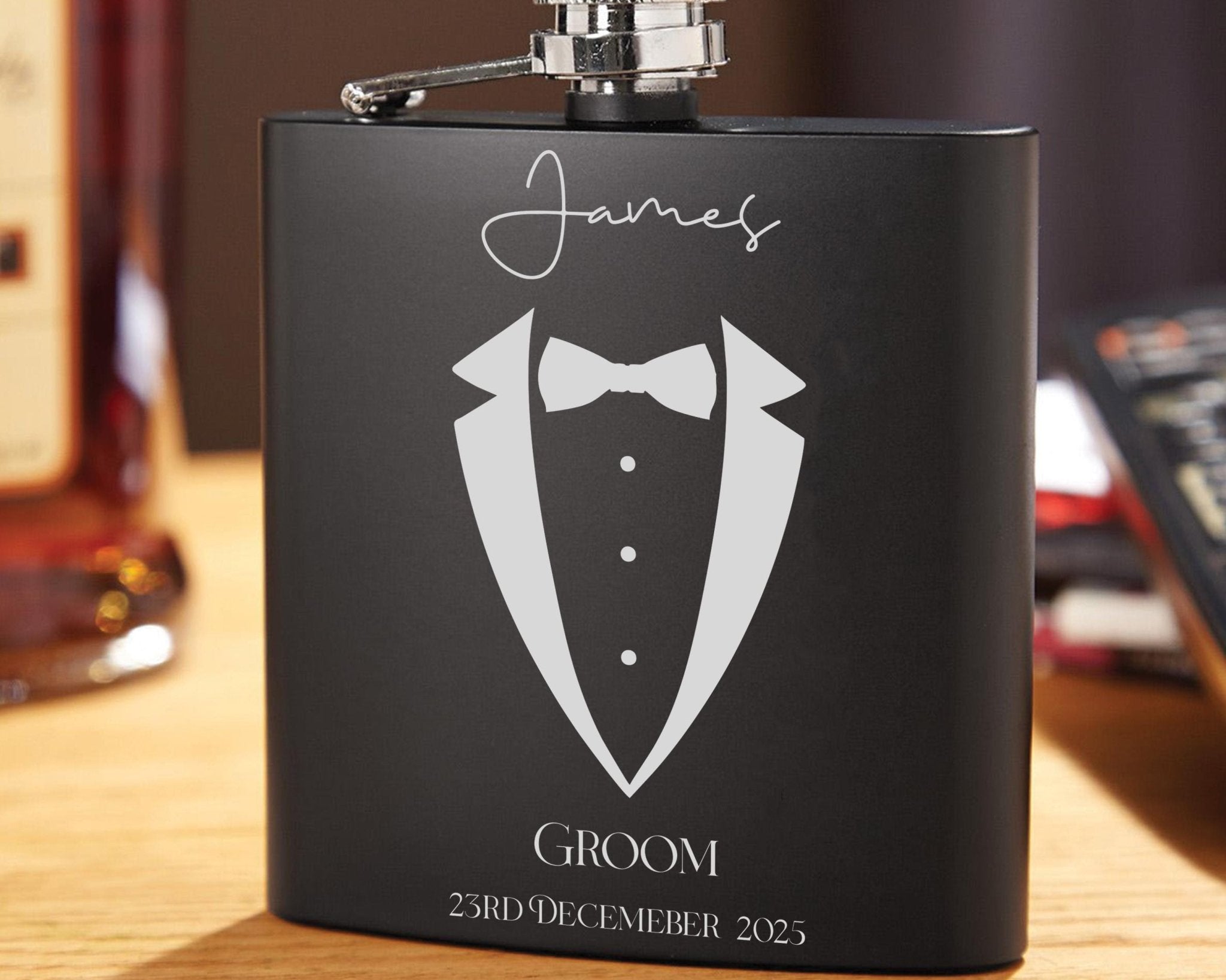 Personalised Groomsmen Hip Flask - Engraved Tuxedo Wedding Gift